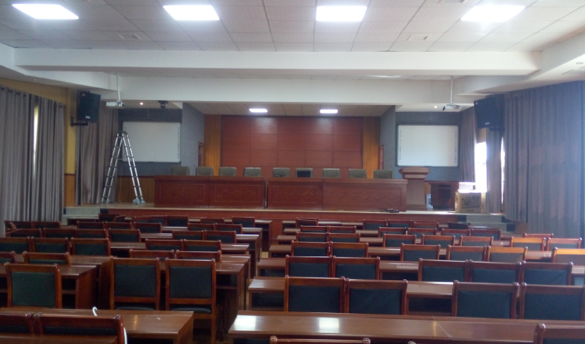 系統由幾部分組成 (會議照明,音響擴聲,大屏幕顯示,會議視象追蹤,中央控制系統,舞臺機械幕布)。